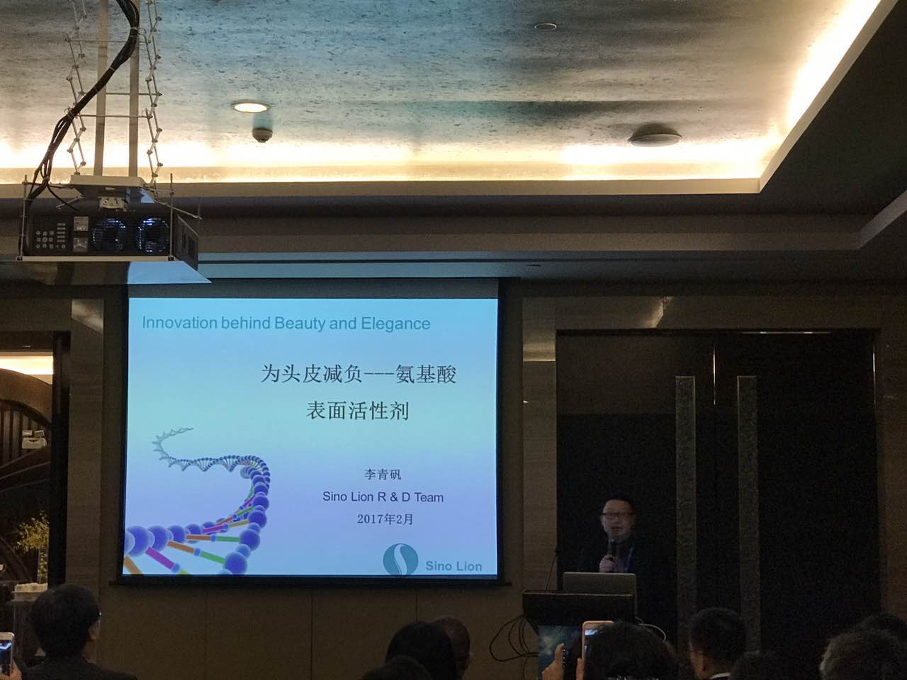 Production Technical Director from SINO LION, Changguo Wang, gave a presentation- “Amino Acid Based Surfactants and its Application Prospects”, introducing the amino acid based surfactants and its sources of raw materials from different aspects including green, environment, sustainability and water saving at the Promotional Meeting of New Products in the afternoon of Feb.22.